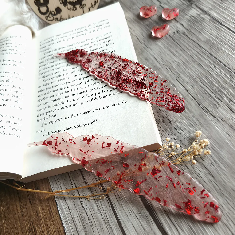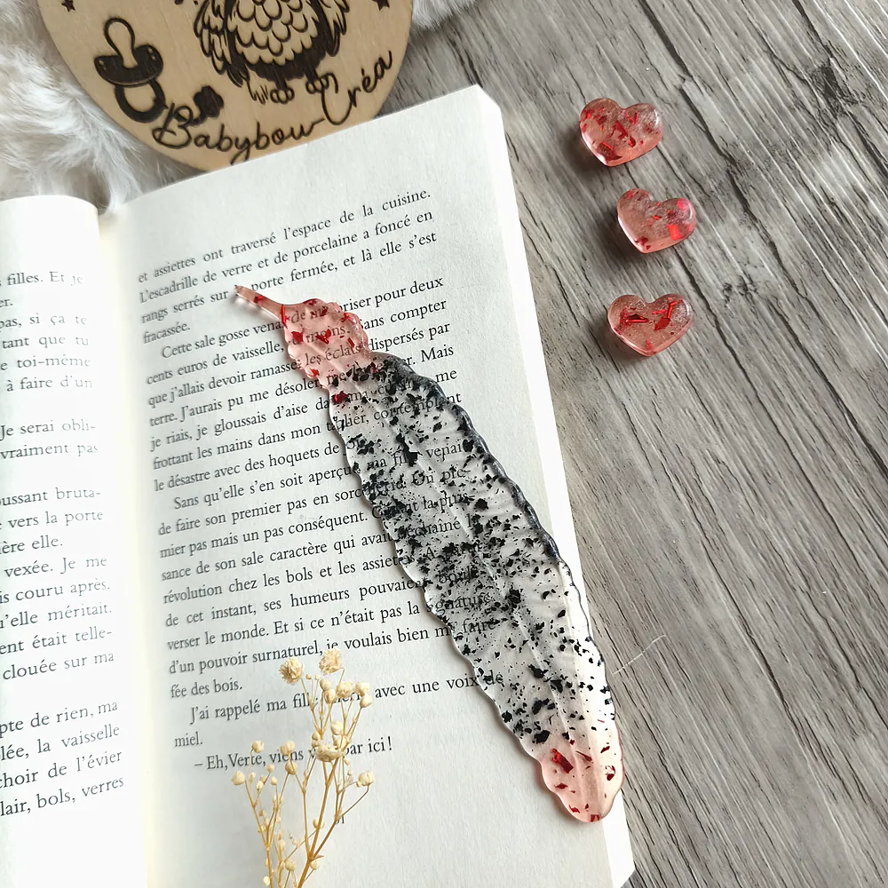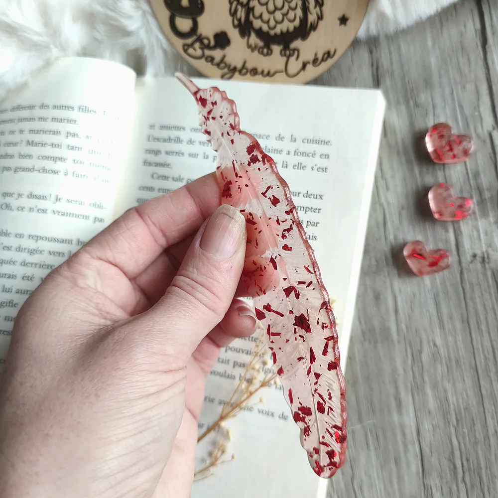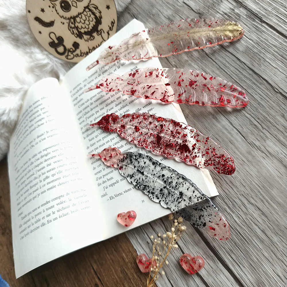 Chaque marque-page plume est réalisé en résine époxy avec une touche de transparence sur l’ensemble des créations, qui met en valeur les pigments et les éléments décoratifs.