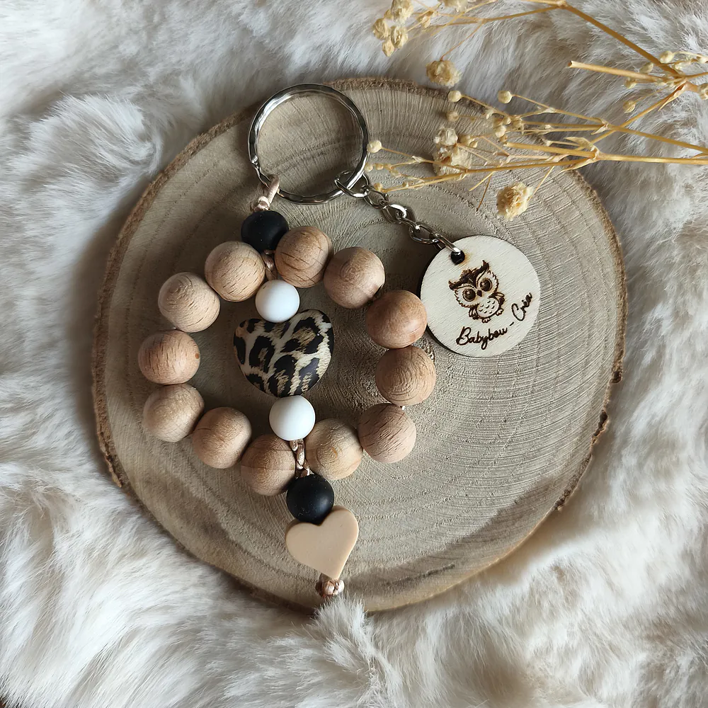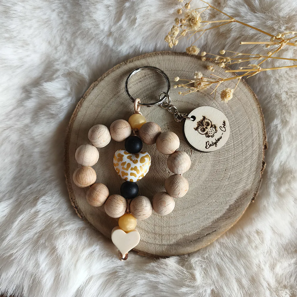Composé de perles en bois de hêtre naturel et silicone, ce porte-clé allie charme et authenticité