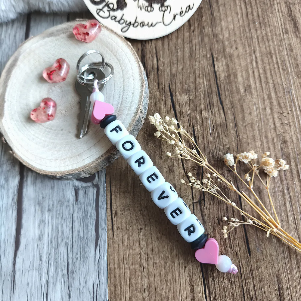 Porte-clés “Cœur à Cœur” en silicone avec de petits cœurs aux extrémités, pour apporter une touche de douceur et d’originalité à un accessoire du quotidien. Personnalisé avec le prénom ou le mot de votre choix, il devient un objet unique, chargé de sens.